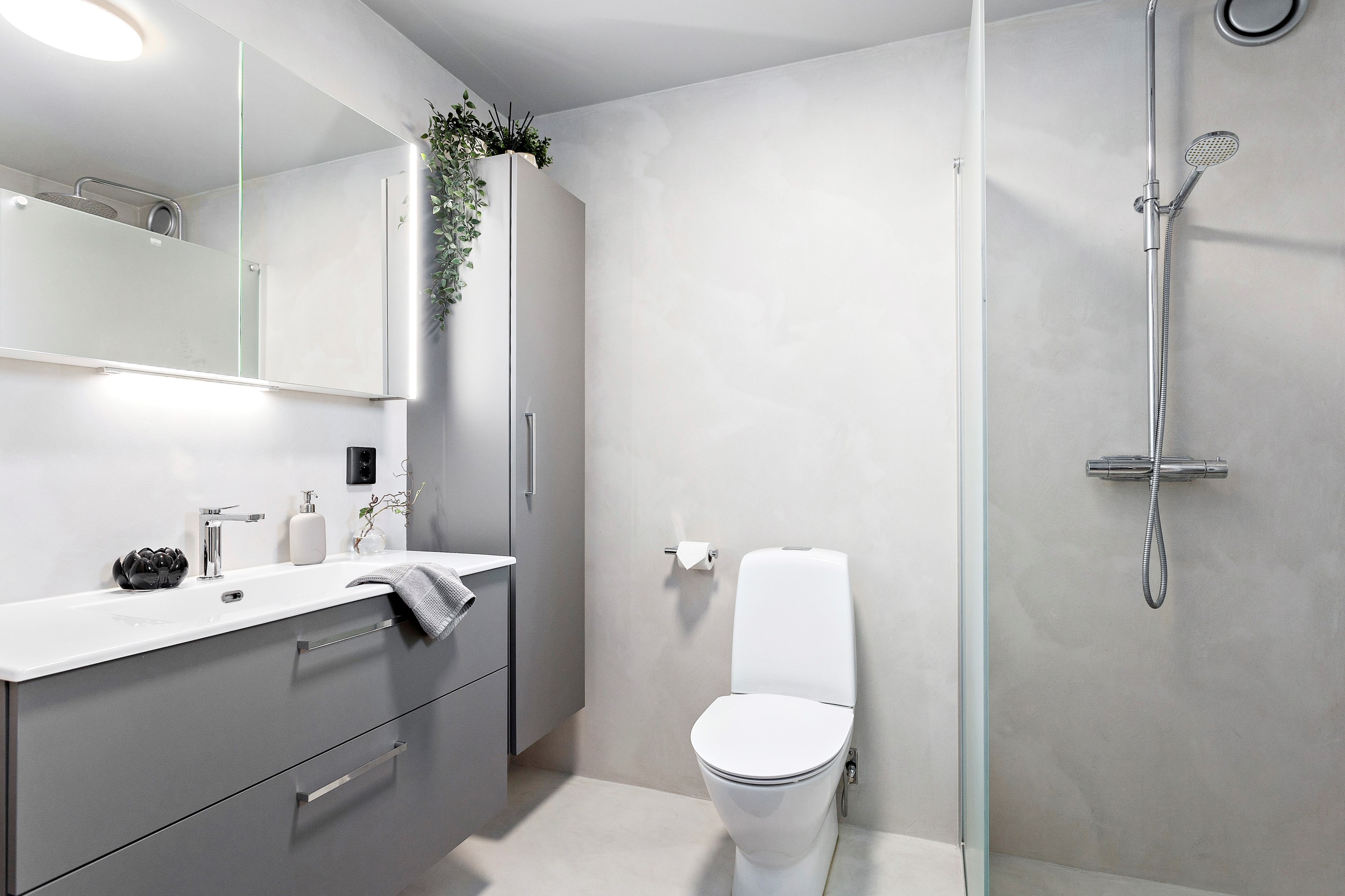 Nya ytskikt i hall, 2 badrum, tvättrum och kök. 2022. Ingrepp i fuktspärr gjordes dock ej. Microcement lagd på befintliga klinkergolv och väggar 2022, samt i hall, 2 badrum, tvättrum och kök. Köksskåp utbytta 2022 Golv i vardagsrum slipning 2025 Tvättmaskin 2025 (LG).