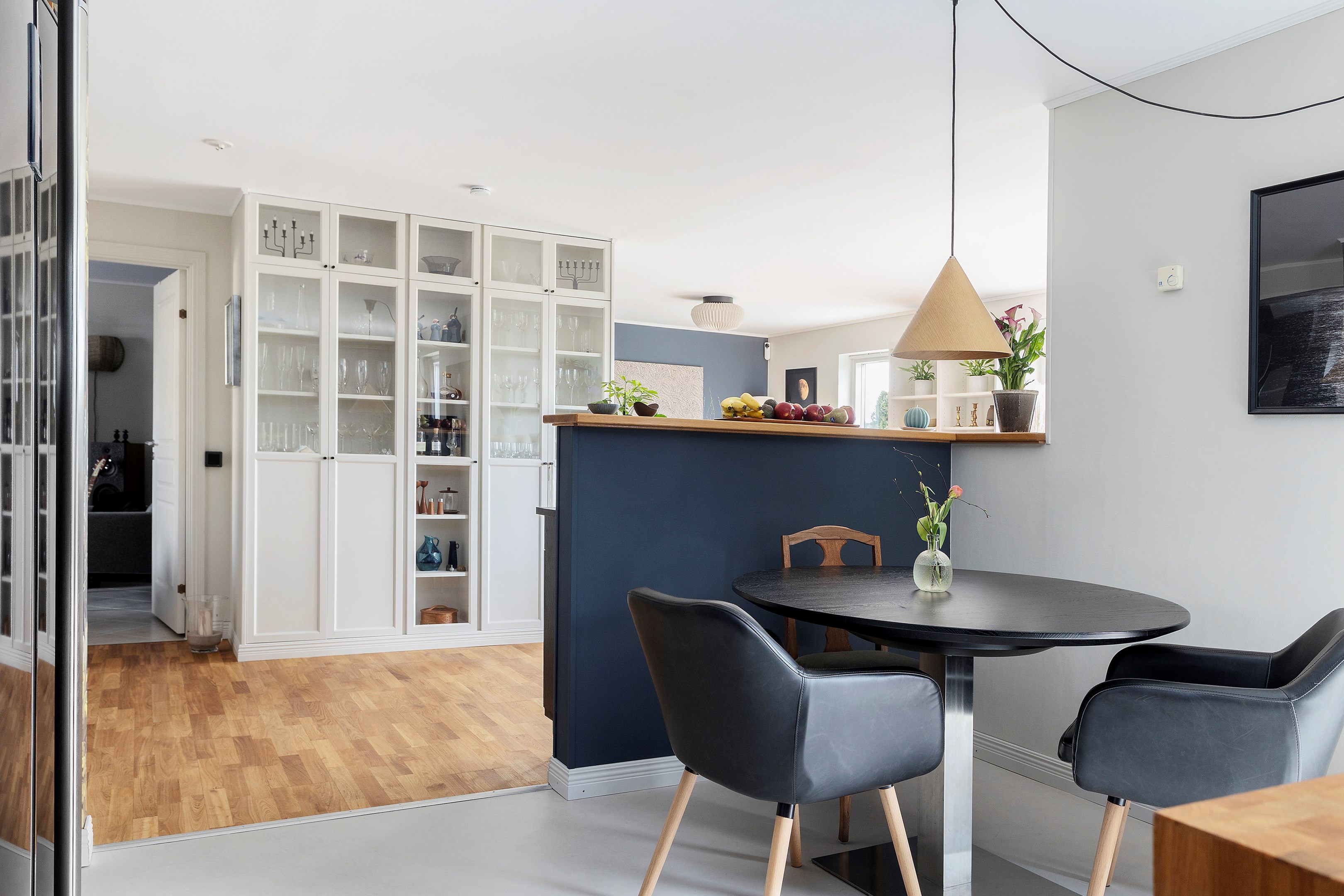 Bottenvåning: Öppen planlösning Entre/hall samt kök och vardagsrum där en del av vardagsrummet avdelats med en inbyggd bokhylla. Ovanvåning:Vardagsutrymme samt tre rymliga sovrum och badrum.